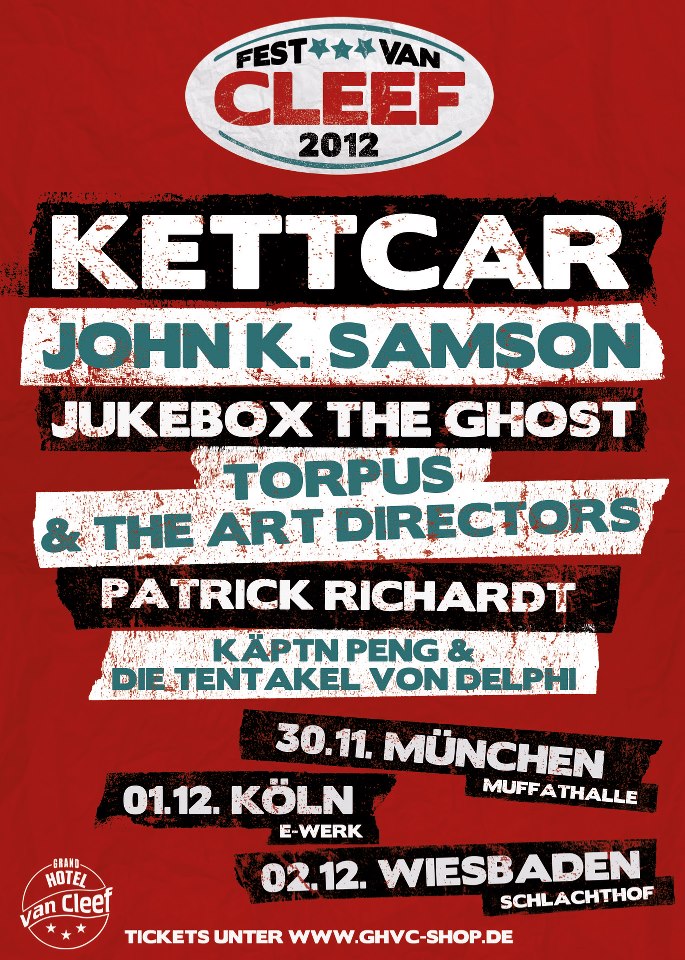 Ab Freitag rollt das “Fest van Cleef” durch’s Land und wir rollen auch mit. Erster Halt ist die Muffathalle in München. Im direkten Anschluss folgen Köln und Wiesbaden. Herrlich wird das. Schaut vorbei und seid hiermit darüber informiert, dass wir als erste Band und somit schon sehr früh auf der Bühne stehen. Liebste Grüße.